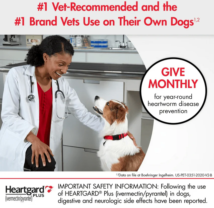 HEARTGARD Plus (ivermectin/pyrantel) Chewables are well tolerated. All dogs should be tested for heartworm infection before starting a preventive program. Following the use of HEARTGARD Plus, digestive and neurological side effects have rarely been reported. For more information, contact your veterinarian or refer to the full prescribing information.